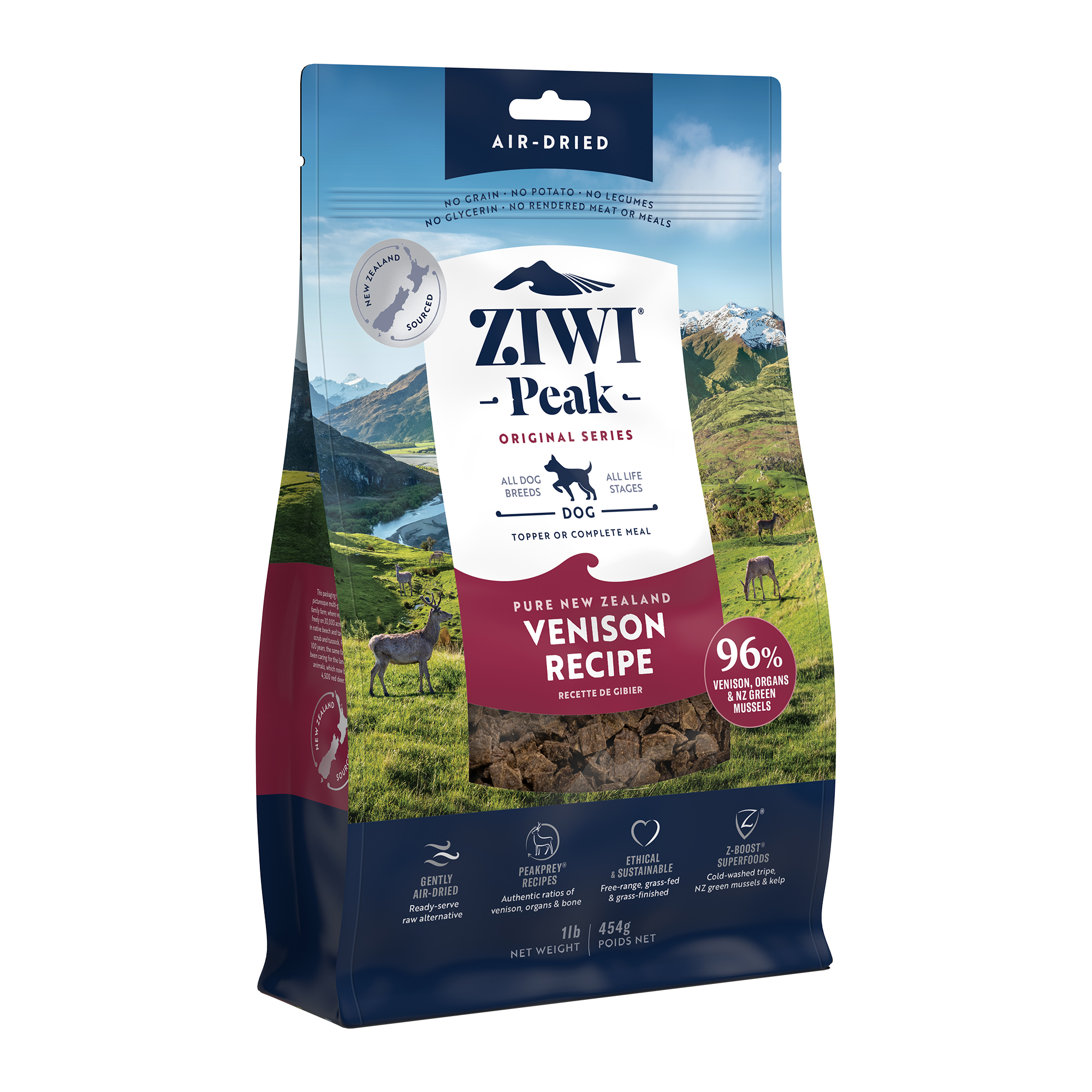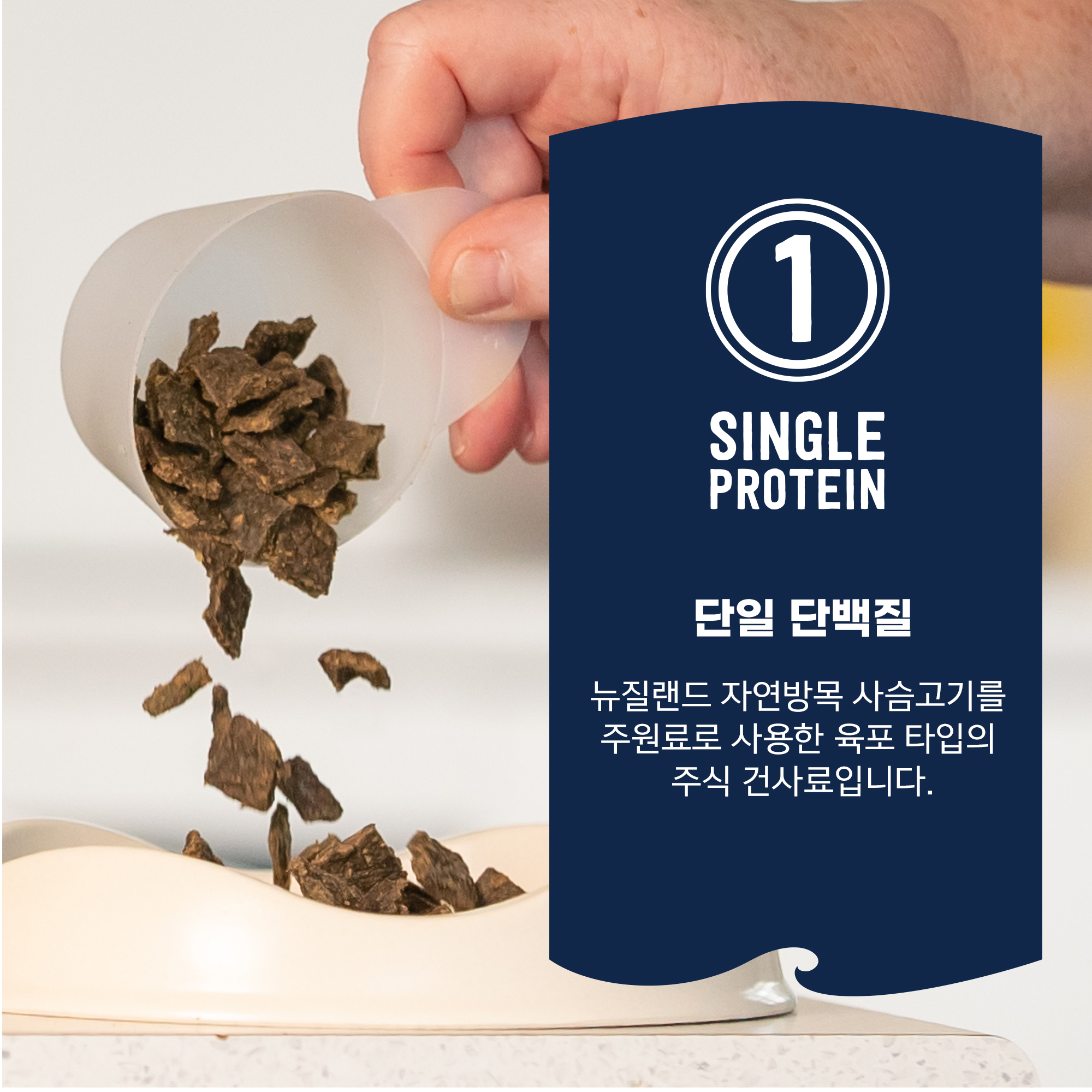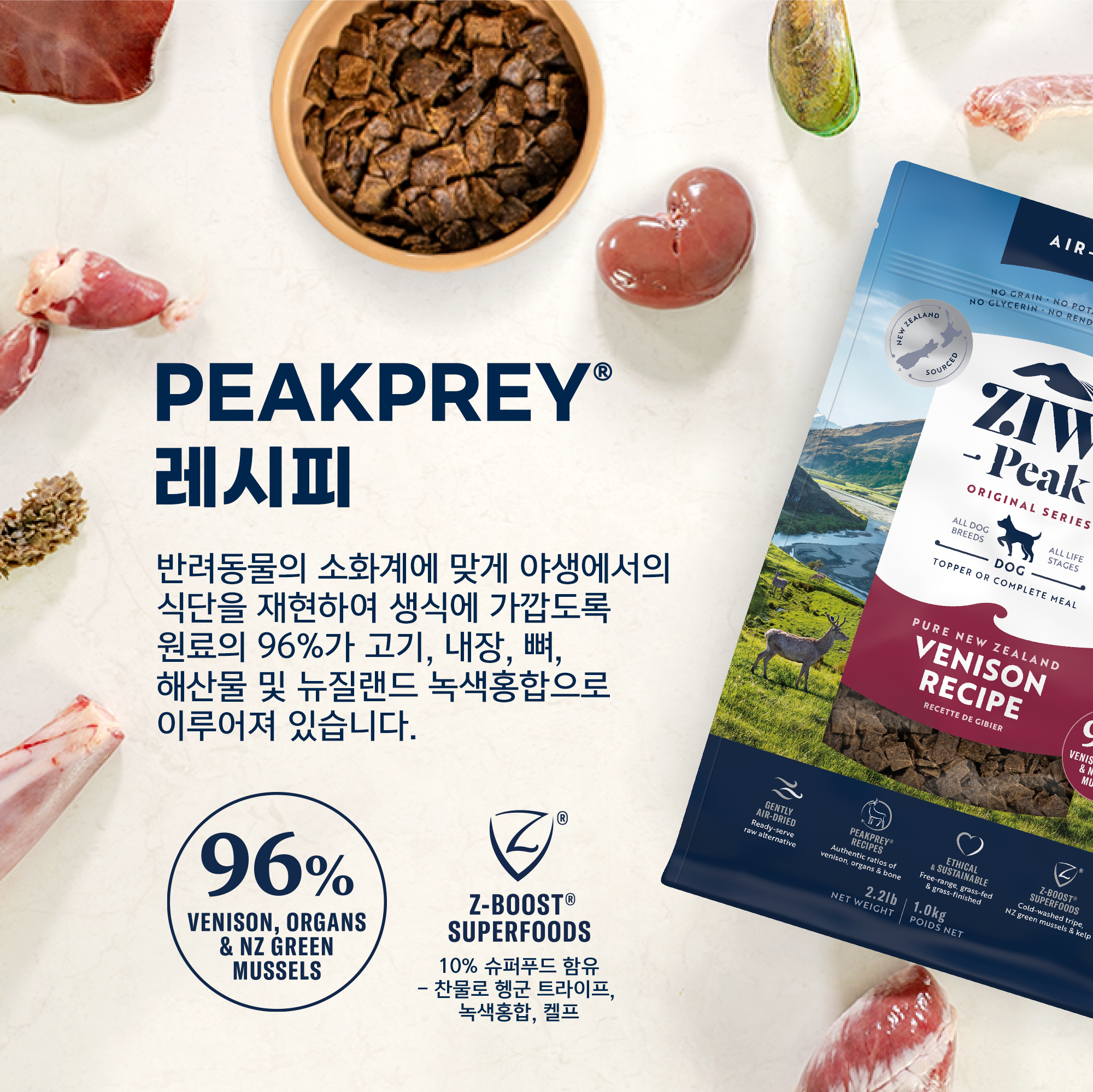 뉴질랜드 자연방목 사슴고기를 주원료로 사용한 육포 타입의 주식 건사료입니다.